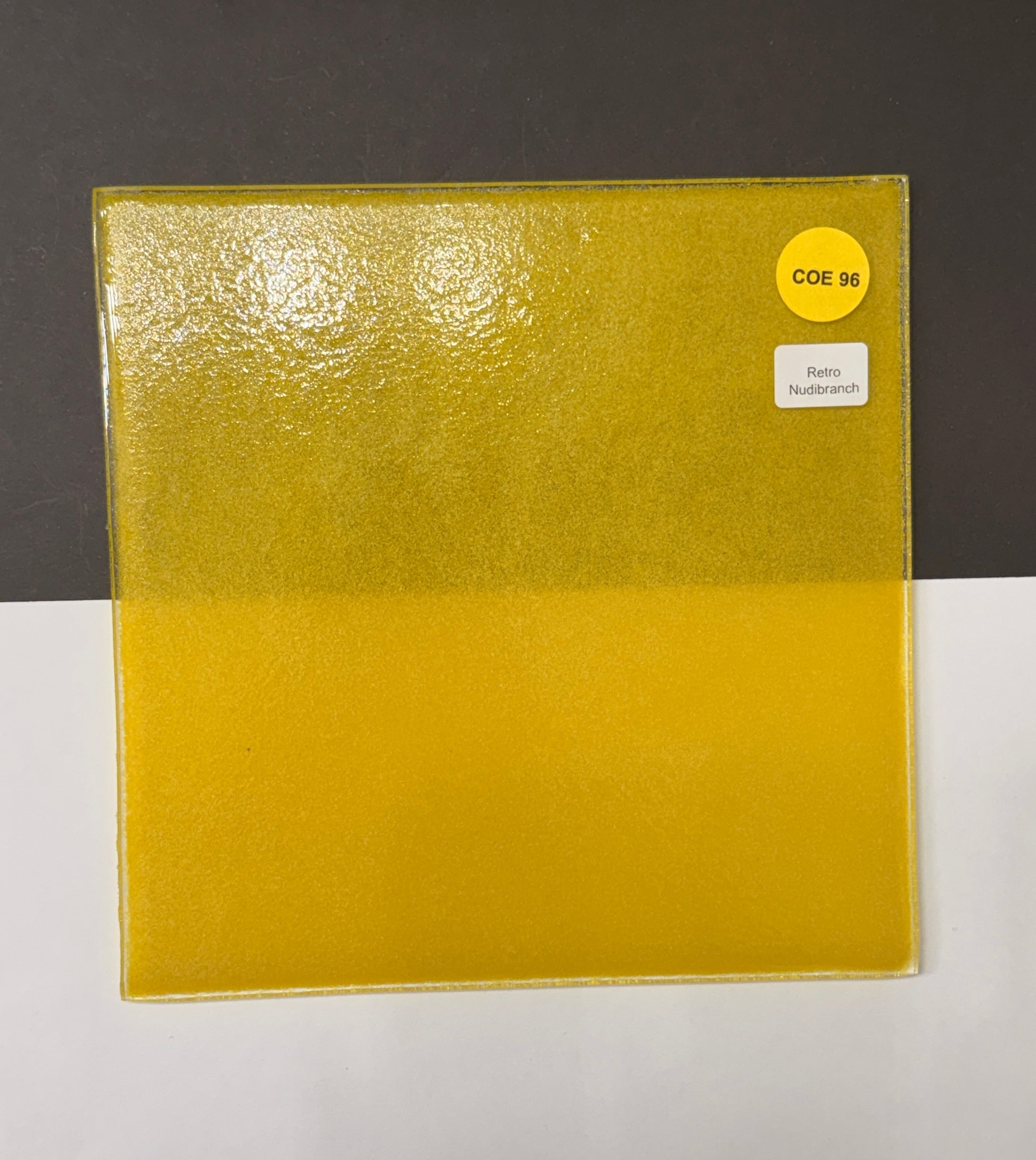 This listing is for 1 sheet of COE 96 Retro Nudibranch - Glow in the Dark glass that looks Yellow during the day, GLOWS purple AND Fluoresces Hot pink under black light. It does require more energy than the other colours. It also gets "bullied" out by other glow colours. But by itself, it is Amazing!! It is handmade here in small batches in the Pacific North West.